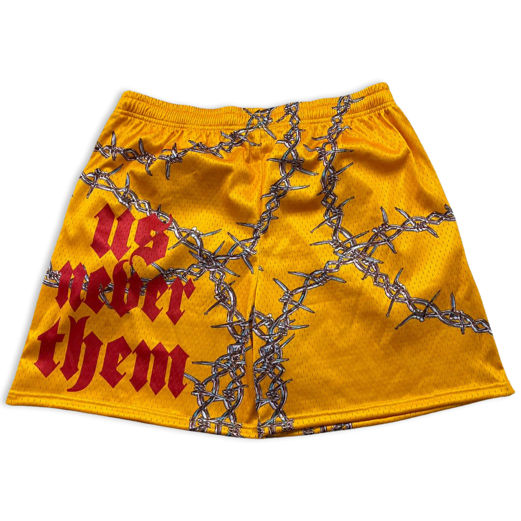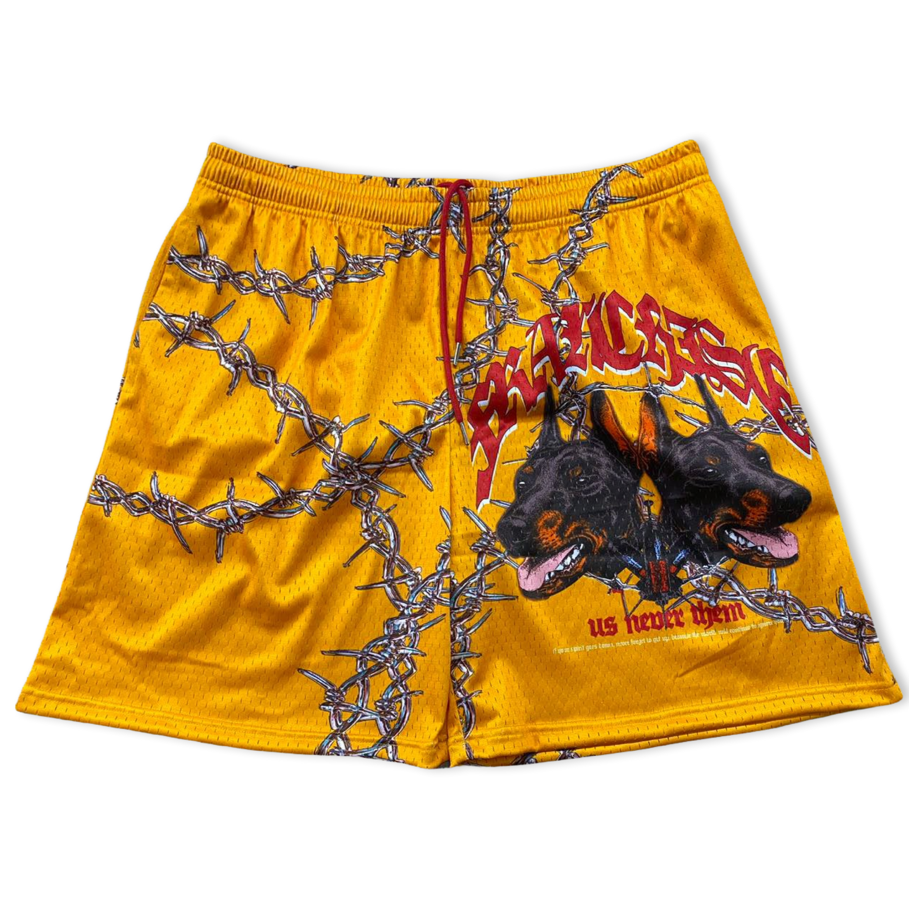 A pair of cut & sewn yellow mesh shorts featuring Franchise us never them Doberman logo on left leg with red drawstring cords, front slanted pockets. The perfect cut & fit.