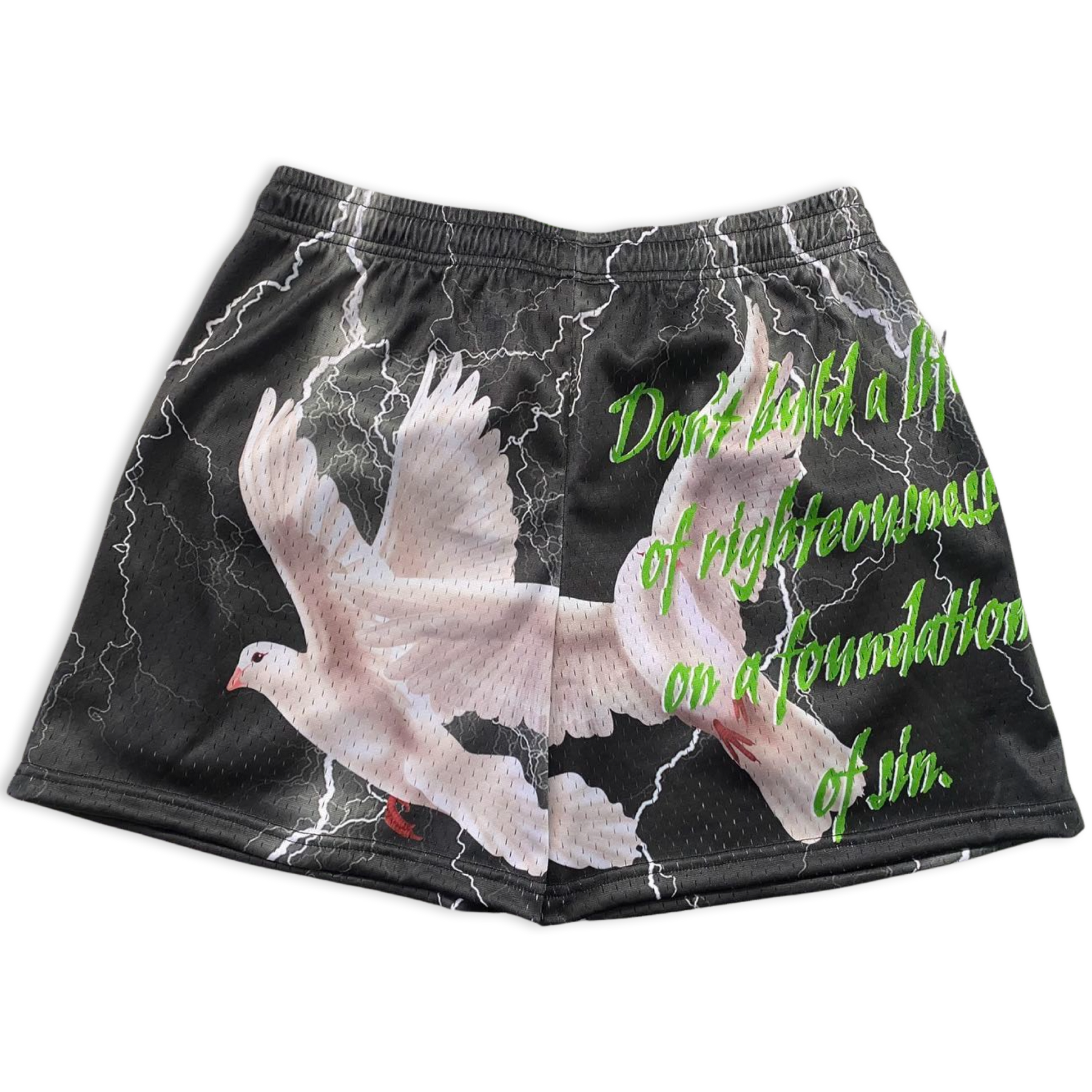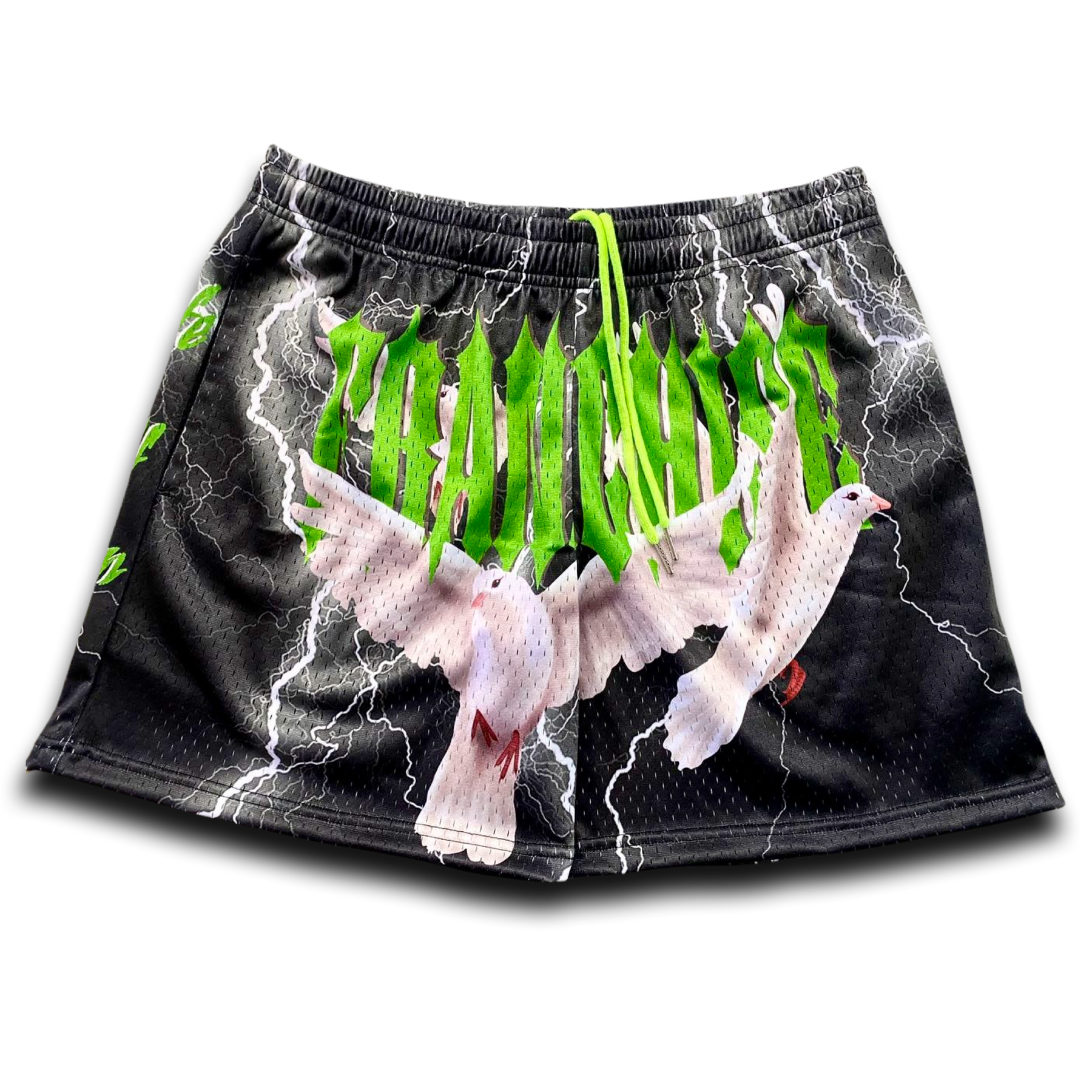 A pair of cut & sewn black mesh shorts featuring Franchise dove logo across center with slime green drawstring cords, front slanted pockets. The perfect cut & fit.