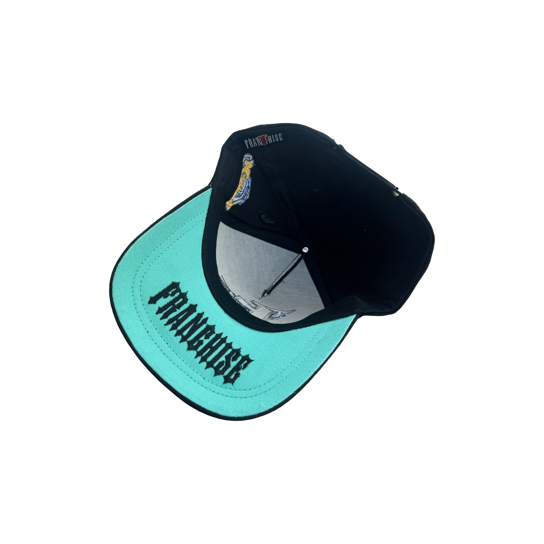 Franchise Tag authentic snapback hat by The Franchise Tag ORIGINAL fit, black deep crown and black visor, teal undervisor featuring Franchise font logo EMBRODIERED along with FT World Series patch logo on left panel with Franchise text on back of hat in white.