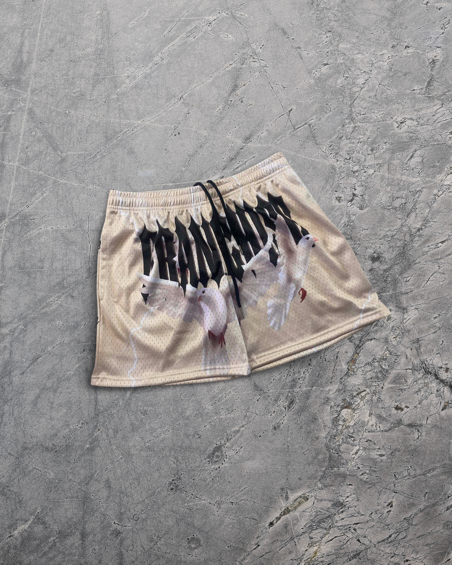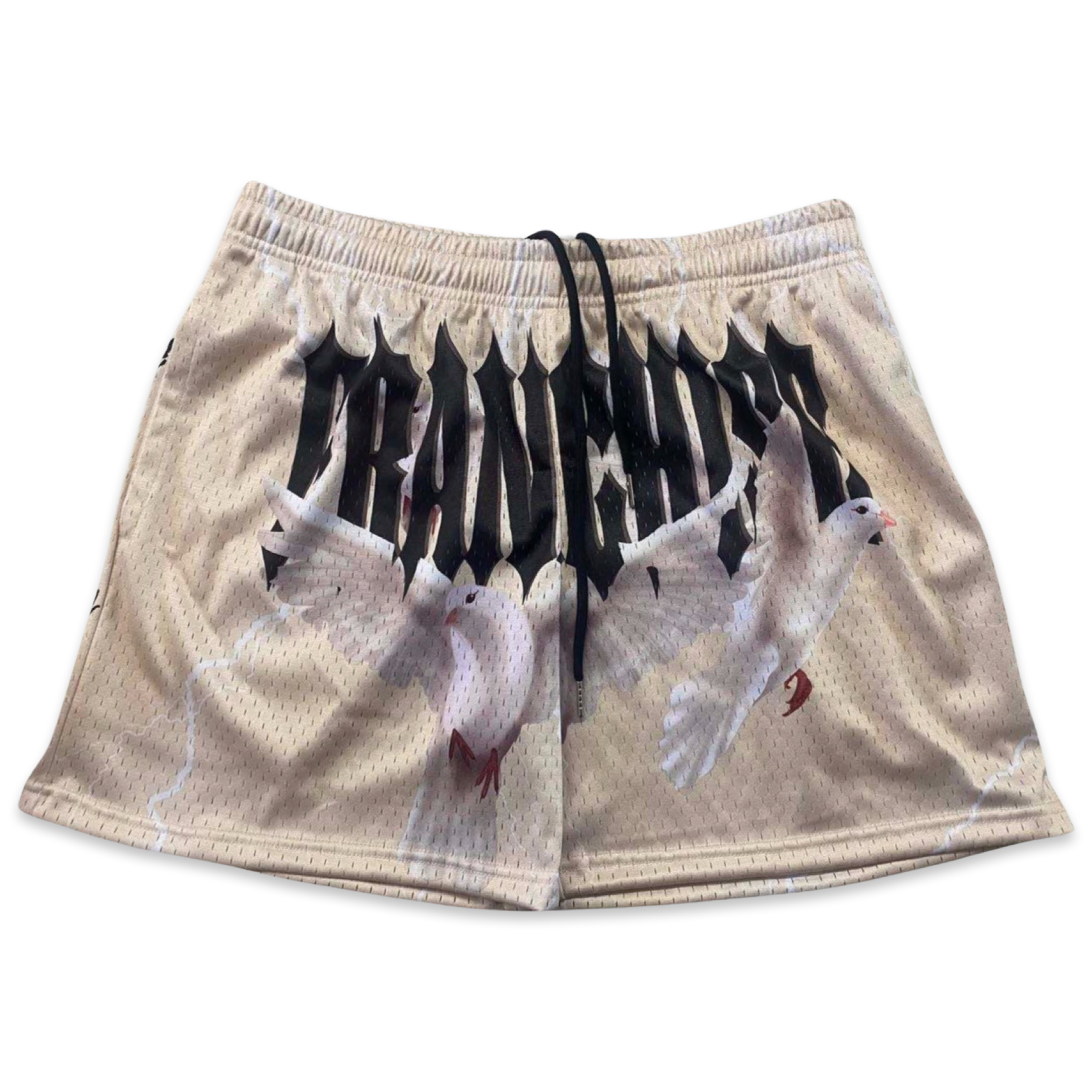 A pair of cut & sewn Creme mesh shorts featuring Franchise Dove logo across center with black drawstring cord waist, front slanted pockets, single back patch flap pocket. Backside features dove graphic and collection slogan.