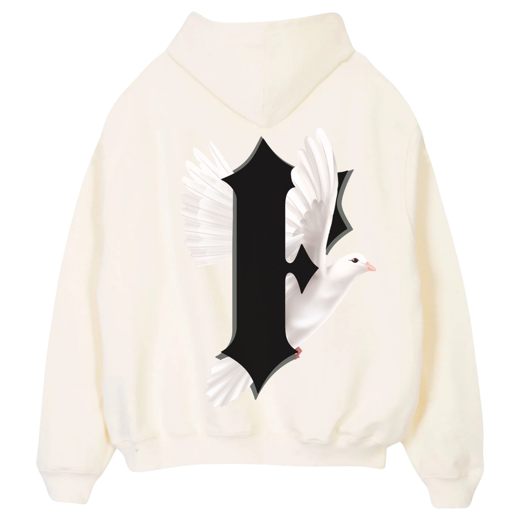 Creme Hoodie slight oversized with tight neck collar. Full Franchise Dove US NEVER THEM direct to garment print. This Holdie features heavyweight terry cotton.