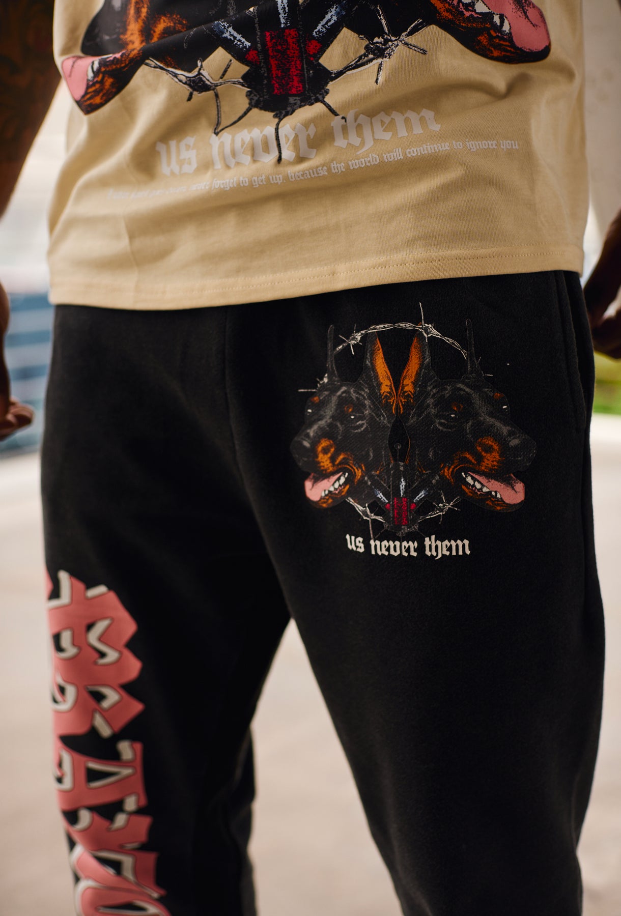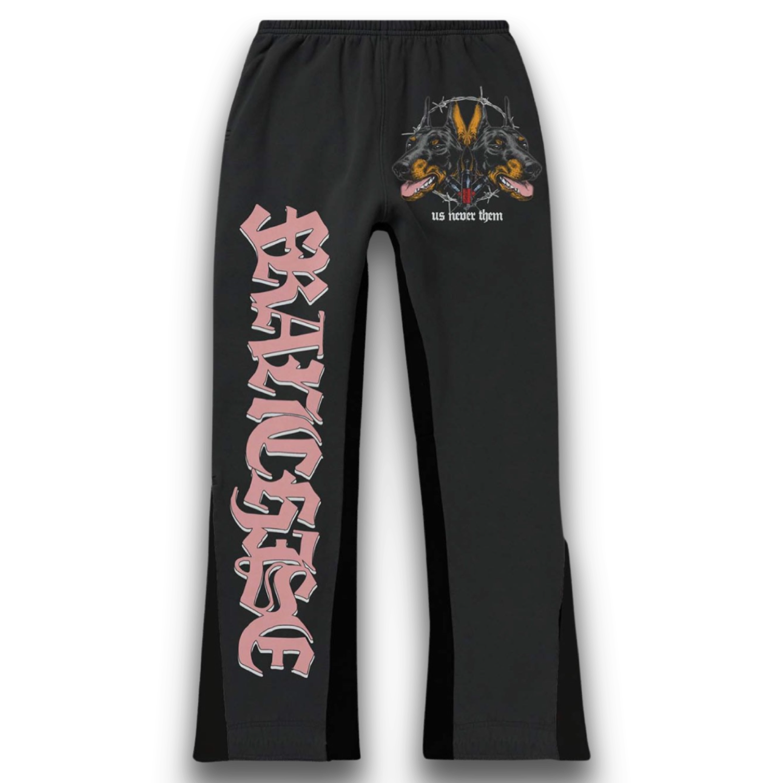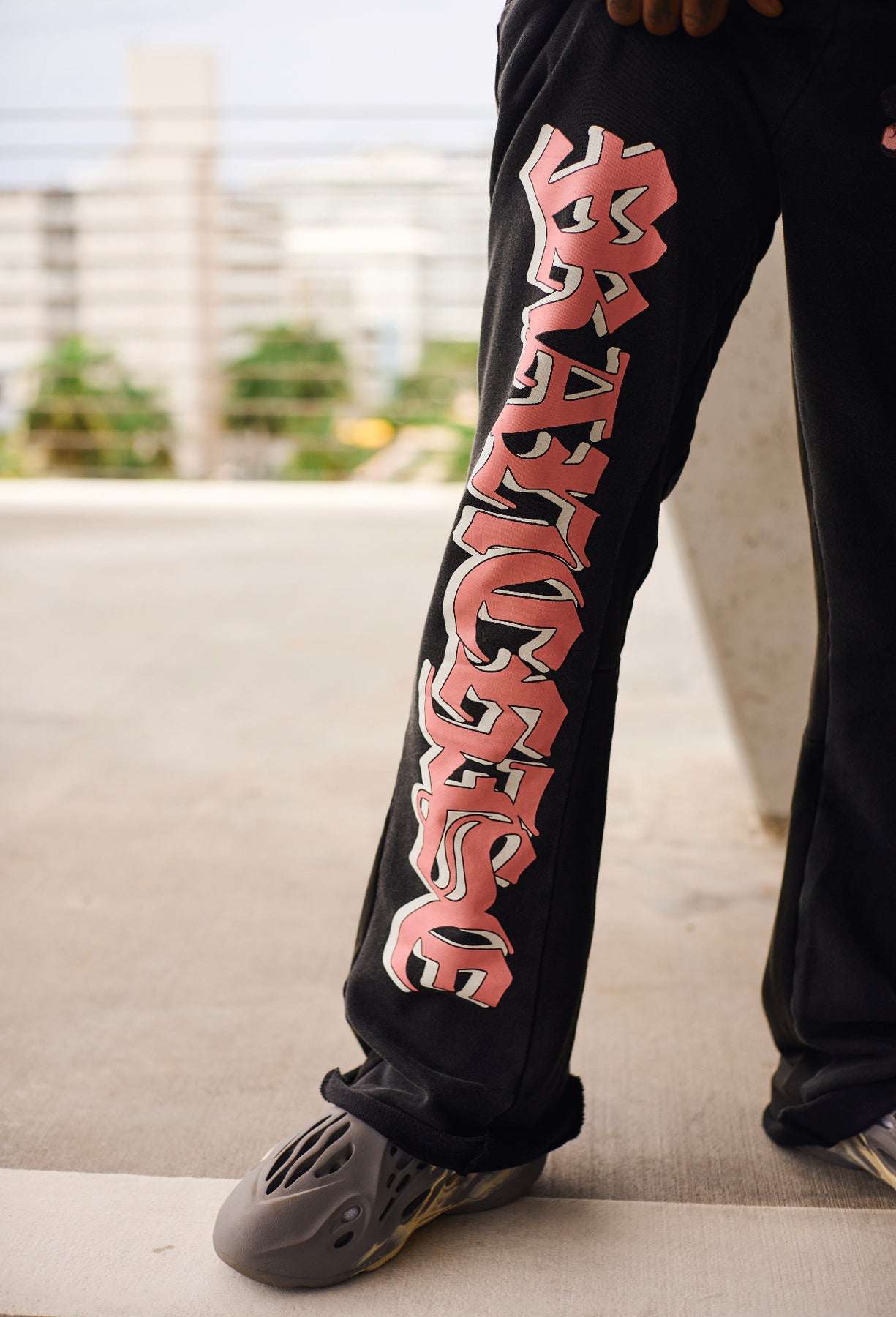 Black wash Flare Sweatpants designed with a washed finish with black flare panel on the leg. Each garment has been adorned with our Us Never Them logo above the left knee and the Franchise font down the front of the right leg. Heavyweight fit with un hemmed open bottom.